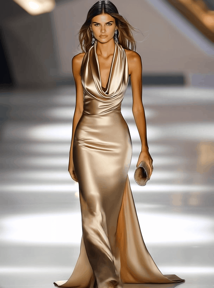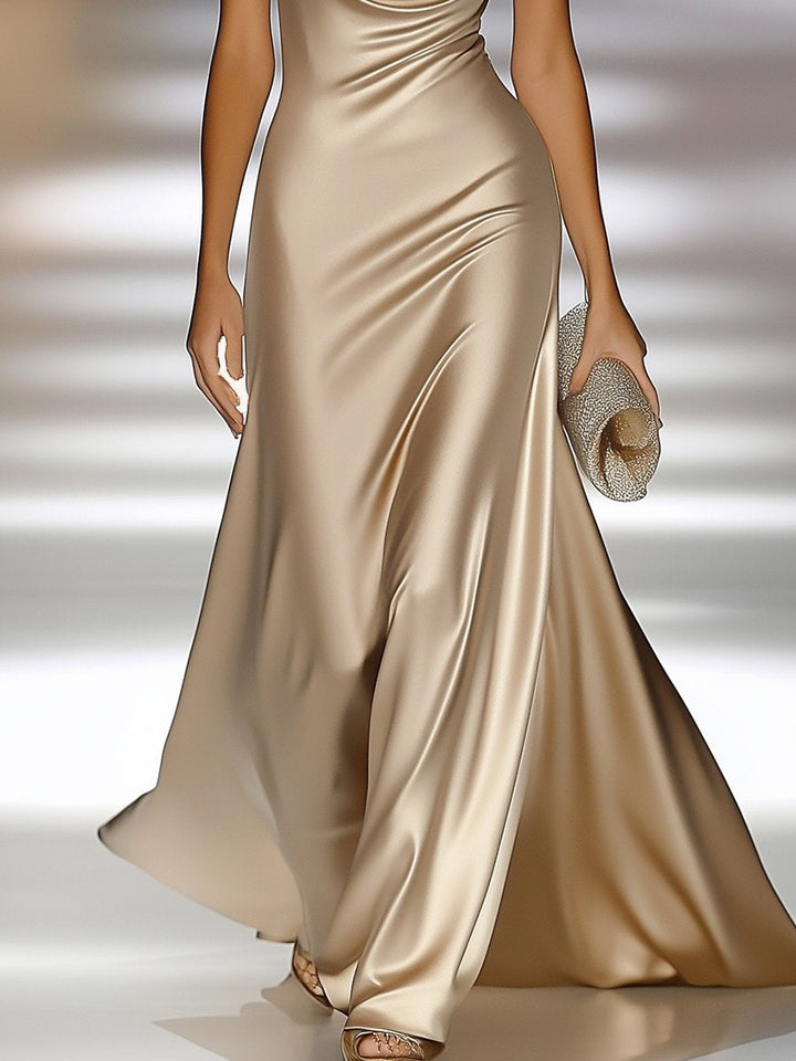 Noelia – Vestido maxi de satén color champán dorado con escote drapeado