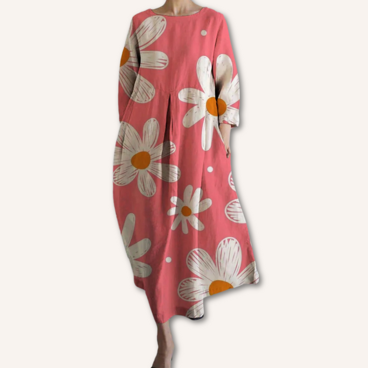 El vestido Iris es ideal para quienes buscan una prenda versátil y cómoda con un diseño llamativo. Su corte largo y ligero lo convierte en la opción perfecta para los días soleados. Con un estampado floral que nunca pasa de moda, este vestido destaca por su elegancia natural.