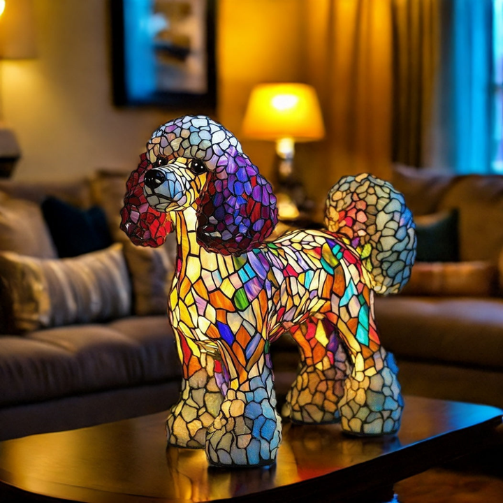 Trae a casa el elegante encanto del Poodle con esta lámpara de estilo vitral. Los detalles y la iluminación cálida la convierten en una adición elegante.