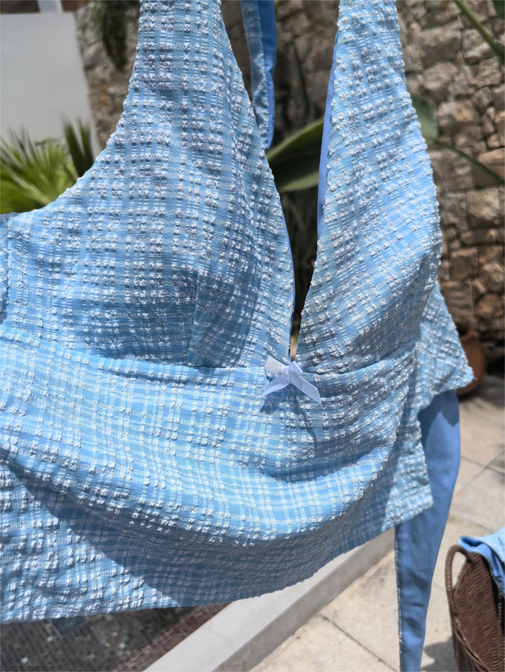 Sayen combina elegancia y comodidad en un conjunto de tankini que resalta por sus detalles delicados. El lazo a cuadros vintage añade un toque distintivo, sutilmente coqueto y atemporal. Su diseño favorecedor abraza el cuerpo sin apretar, perfecto para relajarse con estilo en la playa o en la piscina. Un conjunto pensado para sentirse segura, cómoda y con un toque de encanto retro.