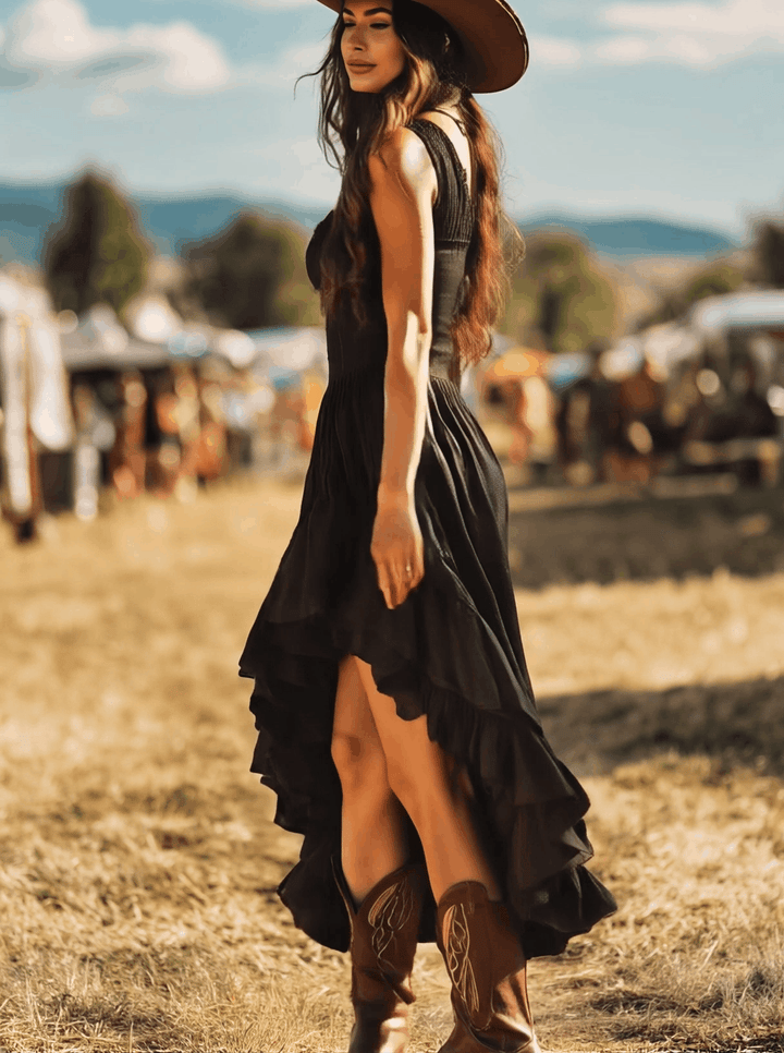 El  vestido Blanca ofrece una atrevida combinación de estilo retro western y elegancia femenina. Con su bajo irregular, detalles plisados y volantes alegres, este vestido largo negro sin mangas irradia fuerza y carácter.